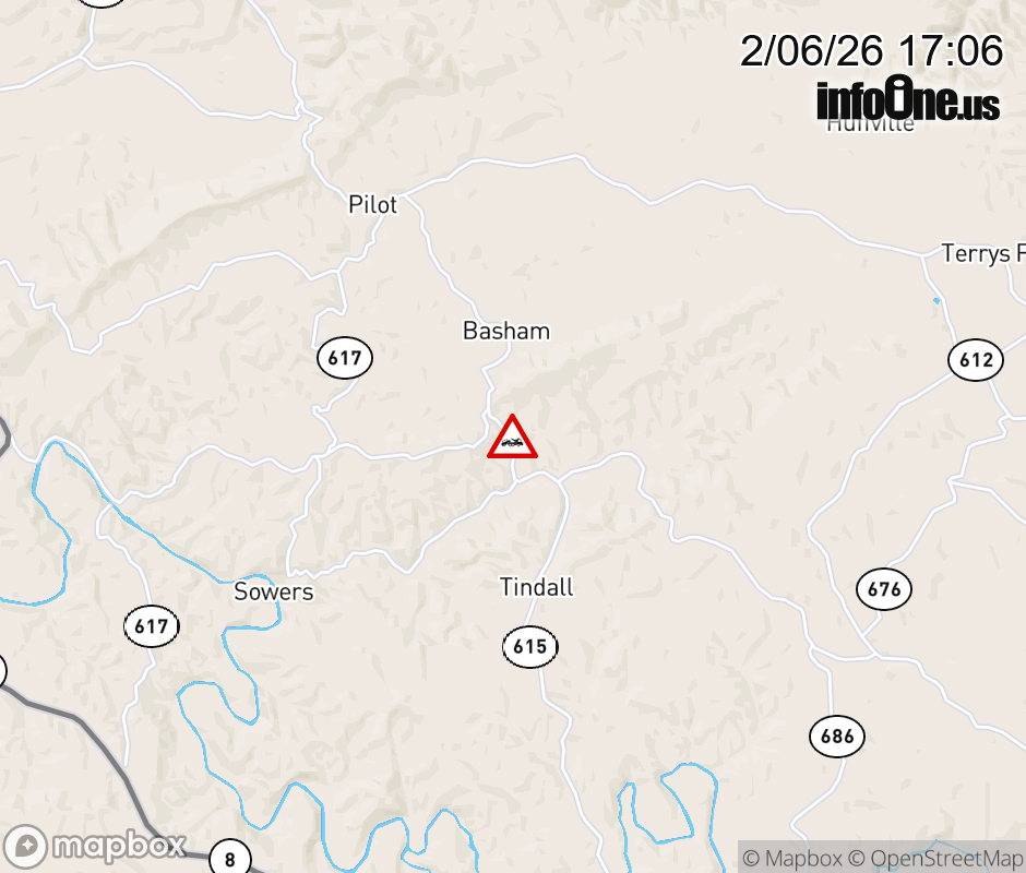 On Rt. 615 in the County of Floyd, in the vicinity of Christiansburg Pike; Dobbins Hollow Rd; Dobbins Hollow Rd NE; Fox Ln; Old Pike Rd; Rt. 615N/S (Montgomery County); Rt. 677E/W (Floyd County); County/C, motorists can expect delays due to a disabled vehicle. All north lanes are closed. All south lanes are closed. Updated: Fri 2/6/26 5:06 PM EST ![]() Updated: Fri 2/6/26 5:06 PM EST |