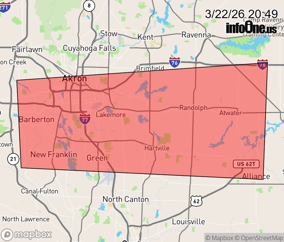 Canceled 3/22/26 9:08 PM Severe Thunderstorm Warning issued March 22 at 8:48PM EDT until March 22 at 9:15PM EDT by NWS Cleveland OH At 848 PM EDT, a severe thunderstorm was located near Barberton, or near Akron, moving east at 55 mph. HAZARD...Ping pong ball size hail. SOURCE...Radar indicated. IMPACT...People and animals outdoors will be injured. Expect damage to roofs, siding, windows, and vehicles. Locations impacted include... Akron, Barberton, Green, Alliance, Tallmadge, Mogadore, Hartville, New Franklin, Norton, Brimfield, Randolph, Lakemore, Atwater, Edinburg, Clinton, Limaville, Greentown, Portage Lakes, and Uniontown. ![]() |