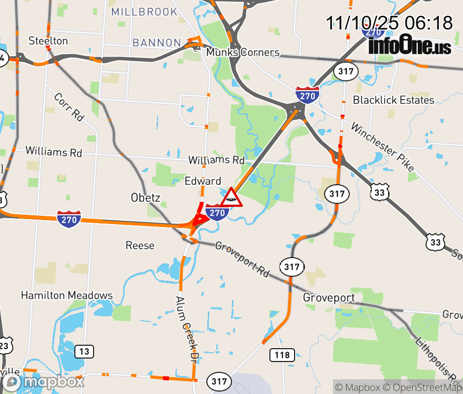 Expect lane closures on I-270 in both directions 0.6 miles beyond Alum Creek Dr. (MM: 48.1), due to crash. ![]() |