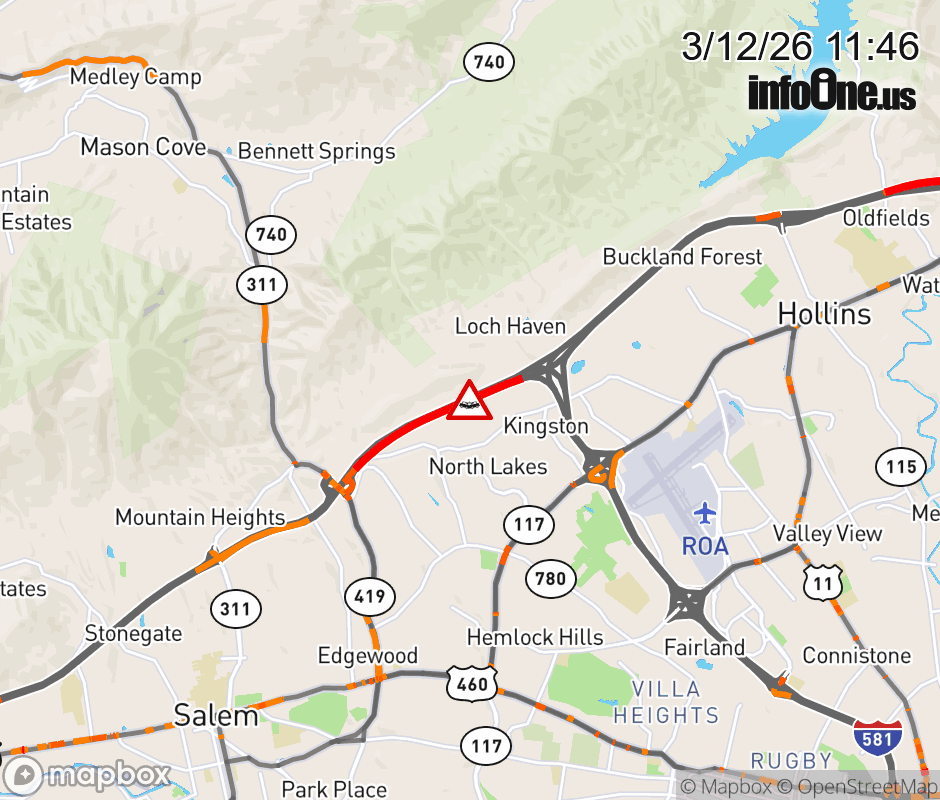 On I-81 at mile marker 143 in the County of Roanoke, motorists can expect delays due to a vehicle crash. The north left shoulder and left lane are closed. Updated: Thu 3/12/26 11:46 AM EDT ![]() Updated: Thu 3/12/26 11:46 AM EDT |