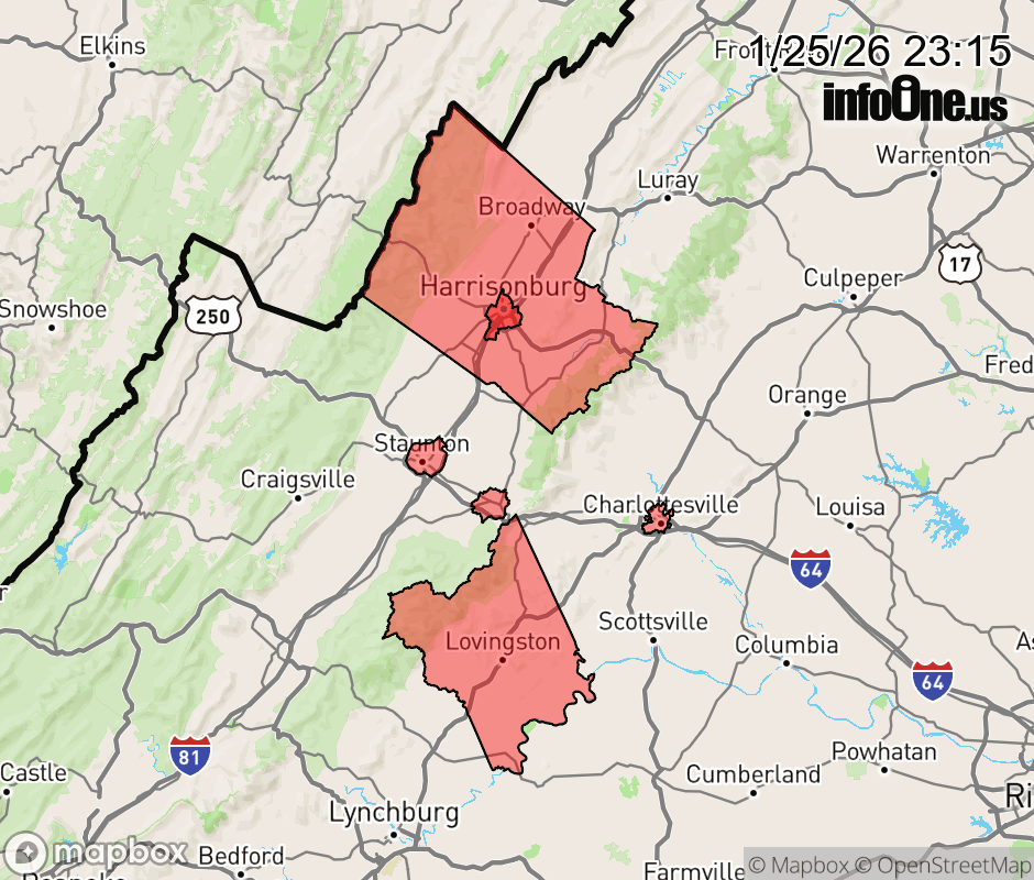 Canceled 1/26/26 7:30 AM Extreme Cold Warning issued January 25 at 11:13PM EST until January 27 at 11:00AM EST by NWS Baltimore MD/Washington DC * WHAT... Dangerously cold wind chills as low as 15 below zero expected. * WHERE... Albemarle, Nelson, Augusta, and Rockingham Counties. * WHEN... From 7 PM Monday to 11 AM EST Tuesday. * IMPACTS... The cold wind chills as low as 15 below zero could result in hypothermia or frostbite if precautions are not taken. Frostbite and hypothermia will occur if unprotected skin is exposed to these temperatures. An extended period of freezing temperatures could cause ruptured water pipes. * ADDITIONAL DETAILS... Additional Cold Weather Headlines are expected at times through the end of the week as the region remains in an Arctic Airmass. ![]() |
