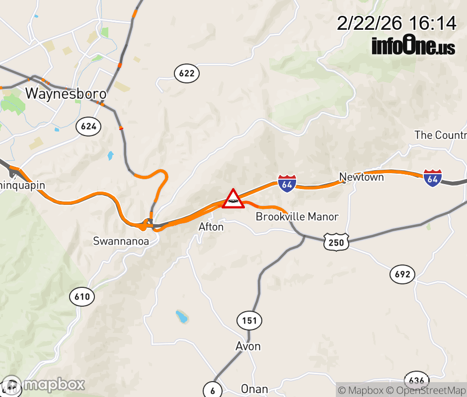 On I-64 West at mile marker 101.4 in the County of Albemarle, motorists can expect delays due to a vehicle crash. Updated: Sun 2/22/26 4:14 PM EST ![]() Updated: Sun 2/22/26 4:14 PM EST |