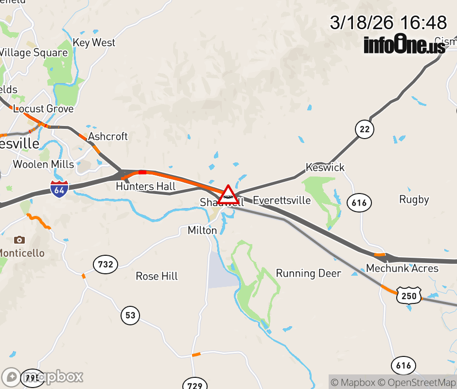 On I-64 at mile marker 126.6 in the County of Albemarle, motorists can expect delays due to a multi-vehicle crash. The east right shoulder is closed. Traffic backups are approximately 2.0 miles. Updated: Wed 3/18/26 4:48 PM EDT ![]() Updated: Wed 3/18/26 4:48 PM EDT |