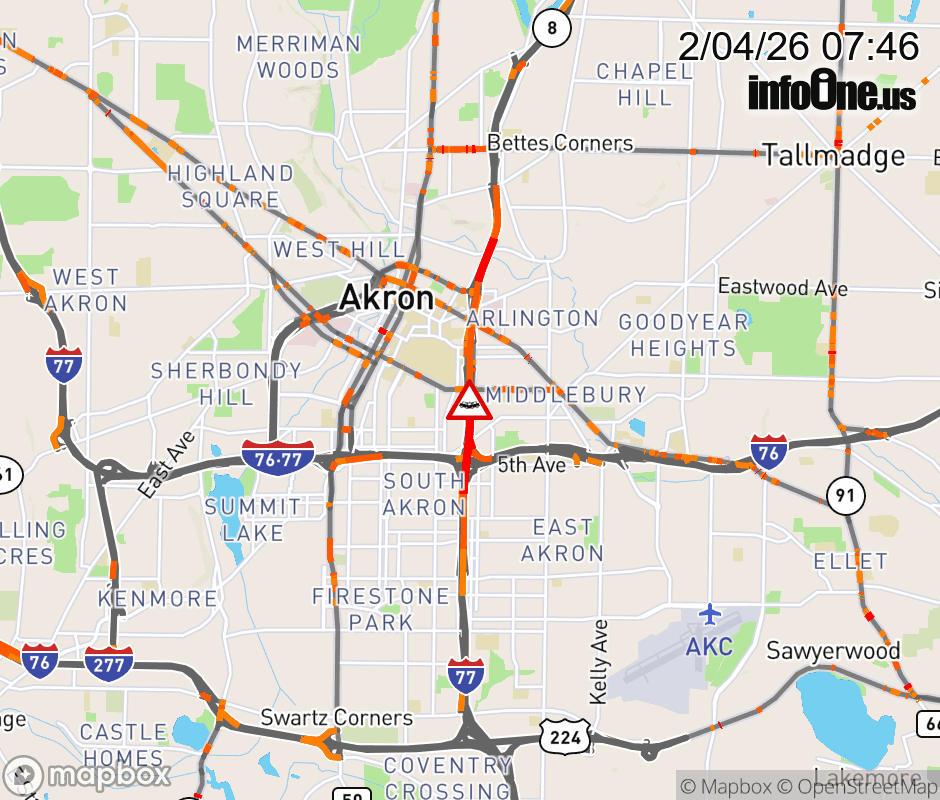 The left lane is blocked on SR-8 North at SR-18/Carroll St/Buchtel Ave, due to a crash. ![]() |