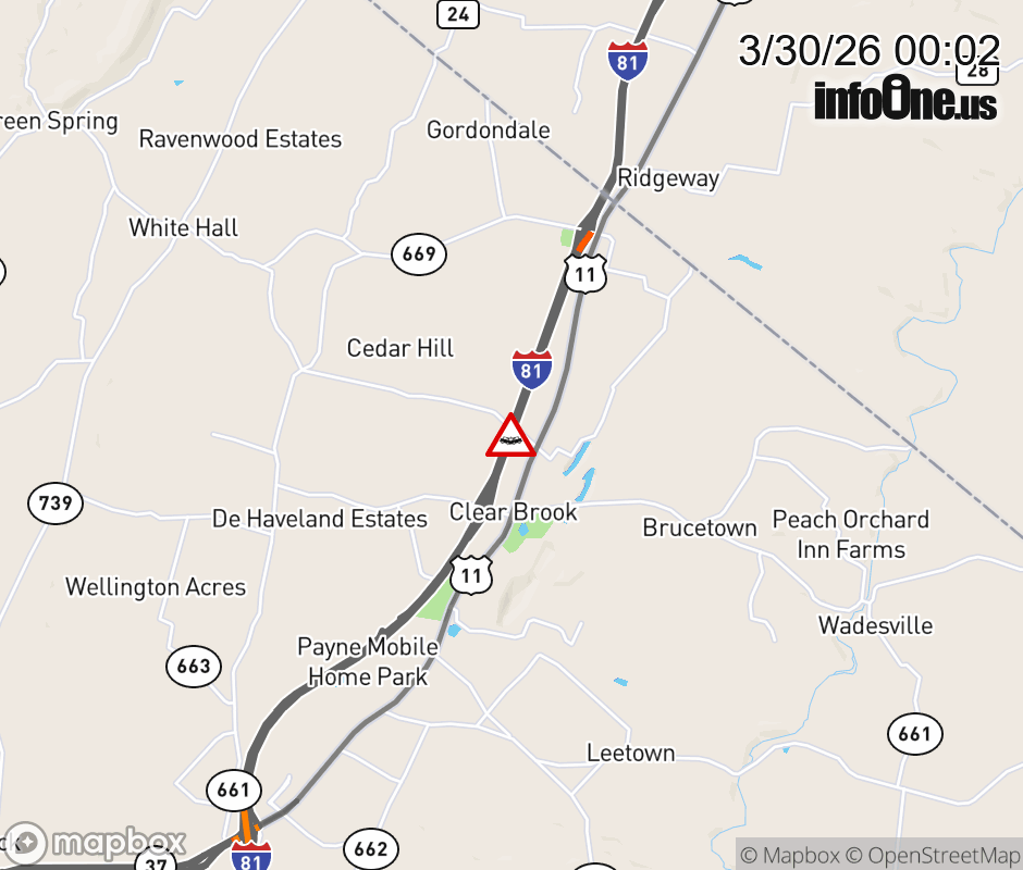 On I-81 at mile marker 322 in the County of Frederick, motorists can expect delays due to a vehicle crash. The north right shoulder is closed. ![]() |