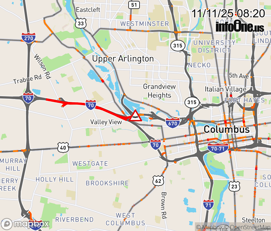 The 2 left lanes are blocked on I-670 East beyond I-70 East, due to a crash. Updated: Tue 11/11/25 8:20 AM EST ![]() Updated: Tue 11/11/25 8:20 AM EST |