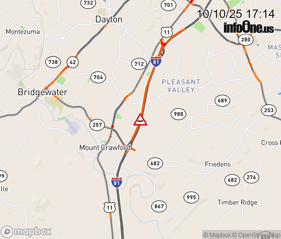 On I-81 South at mile marker 241 in the County of Rockingham, motorists can expect delays due to a vehicle crash. Traffic backups are approximately 5.0 miles. Updated: Fri 10/10/25 5:14 PM EDT ![]() Updated: Fri 10/10/25 5:14 PM EDT |