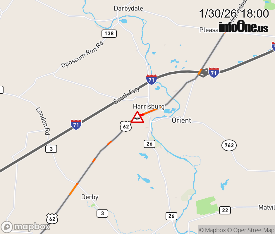 US-62 CLOSED in BOTH DIRECTIONS at Harrisburg Rd (MM: 6.9), due to crash. Use alternate route. US-62 CLOSED in BOTH DIRECTIONS at Harrisburg Rd (MM: 6.9), due to crash. Use alternate route. ![]() |