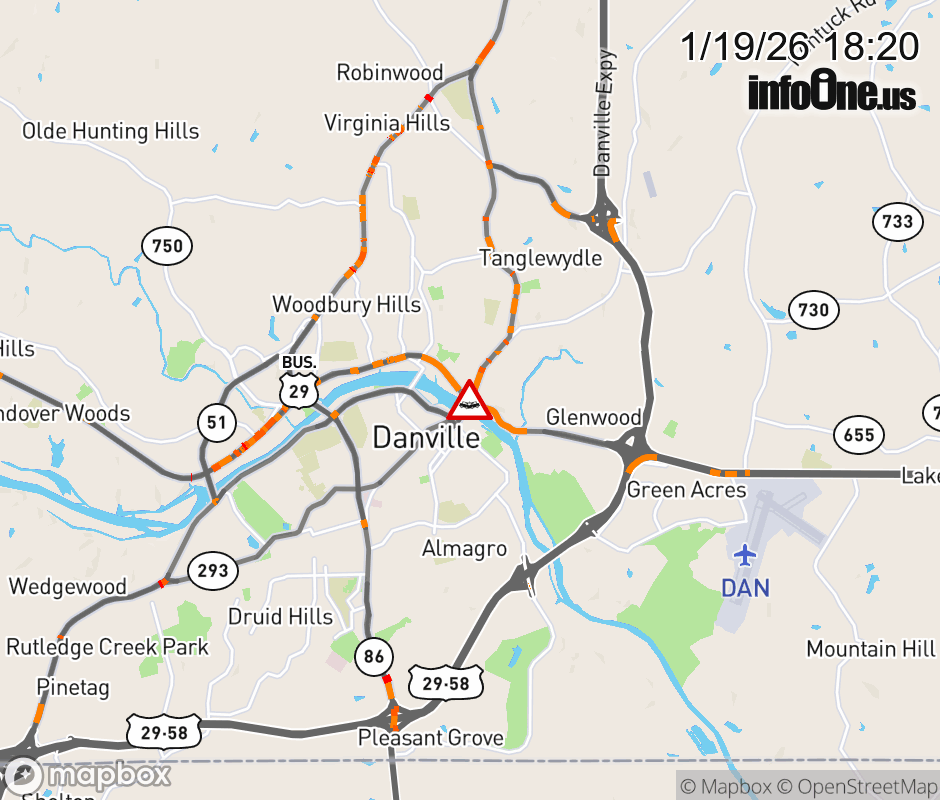 On US-360 East in the County of Essex, in the vicinity of Howerton Rd; Turnout; Rt. 620N/S (Essex County), motorists can expect delays due to a vehicle crash. Lane closures exist. ![]() |