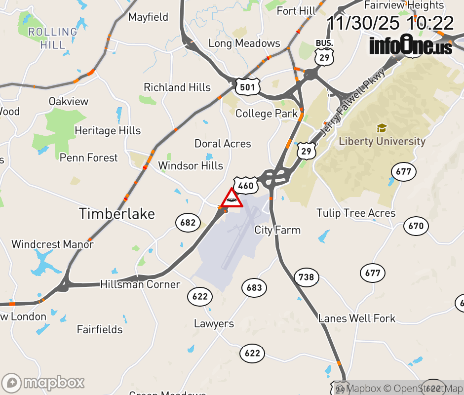 On US-460 West in the County of Campbell, in the vicinity of Airport Rd; Lynchburg Hwy Rmp G; Lynchburg Hwy Rmp J; Waterlick Rd, motorists can expect delays due to a vehicle crash. Lane closures exist. ![]() |