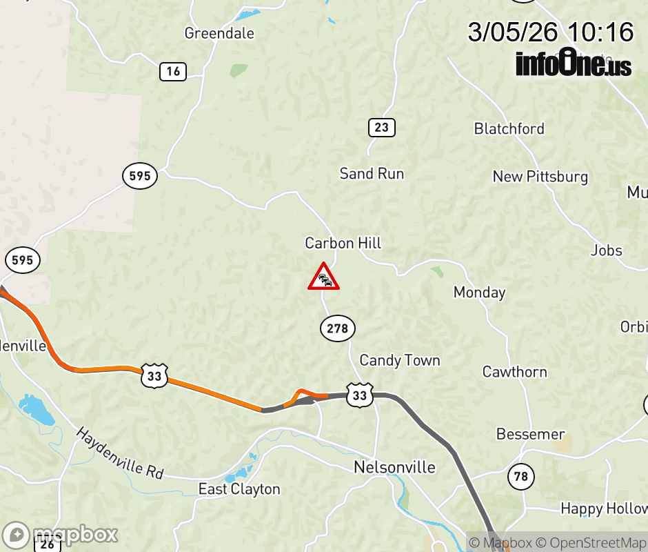 SR-278 CLOSED in BOTH DIRECTIONS from Coe Hollow-Fruitdale Rd to Hawk St (MM: 7.4), due to flooding. Use alternate route. ![]() |