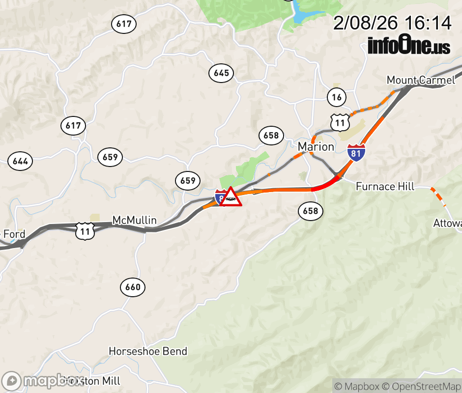 On I-81 at mile marker 43.6 in the County of Smyth, motorists can expect delays due to a vehicle crash. The north left shoulder is closed. ![]() |