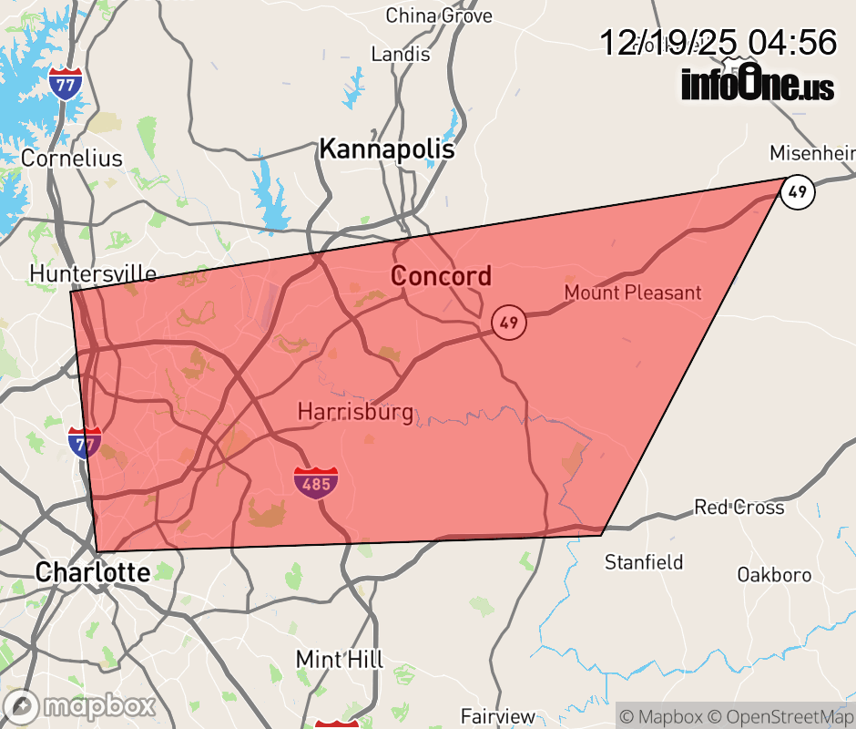 Canceled 12/19/25 5:13 AM Severe Thunderstorm Warning issued December 19 at 4:55AM EST until December 19 at 6:00AM EST by NWS Greenville-Spartanburg SC SVRGSP The National Weather Service in Greenville-Spartanburg has issued a * Severe Thunderstorm Warning for... Cabarrus County in the Piedmont of North Carolina... Central Mecklenburg County in the Piedmont of North Carolina... * Until 600 AM EST. * At 455 AM EST, a severe thunderstorm was located 6 miles southwest of Downtown Concord, or over Charlotte Motor Speedway, moving east at 45 mph. HAZARD...60 mph wind gusts. SOURCE...Radar indicated. IMPACT...Expect damage to trees and power lines. * Locations impacted include... Downtown Concord, Northeast Charlotte, West Concord, Harrisburg, Mt Pleasant, University City, Reedy Creek Park, Charlotte Motor Speedway, Hidden Valley, and Croft. ![]() |