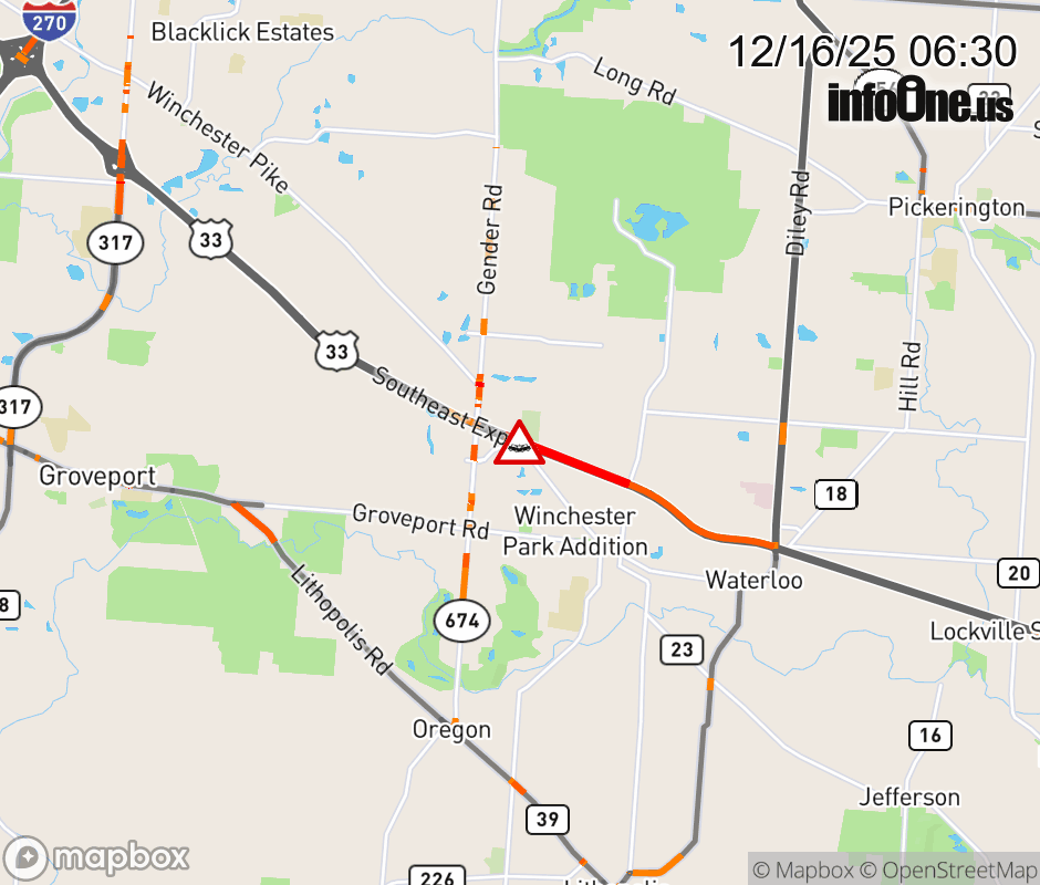 The left lane is blocked on US-33 West at SR-674/Gender Rd, due to a crash. ![]() |