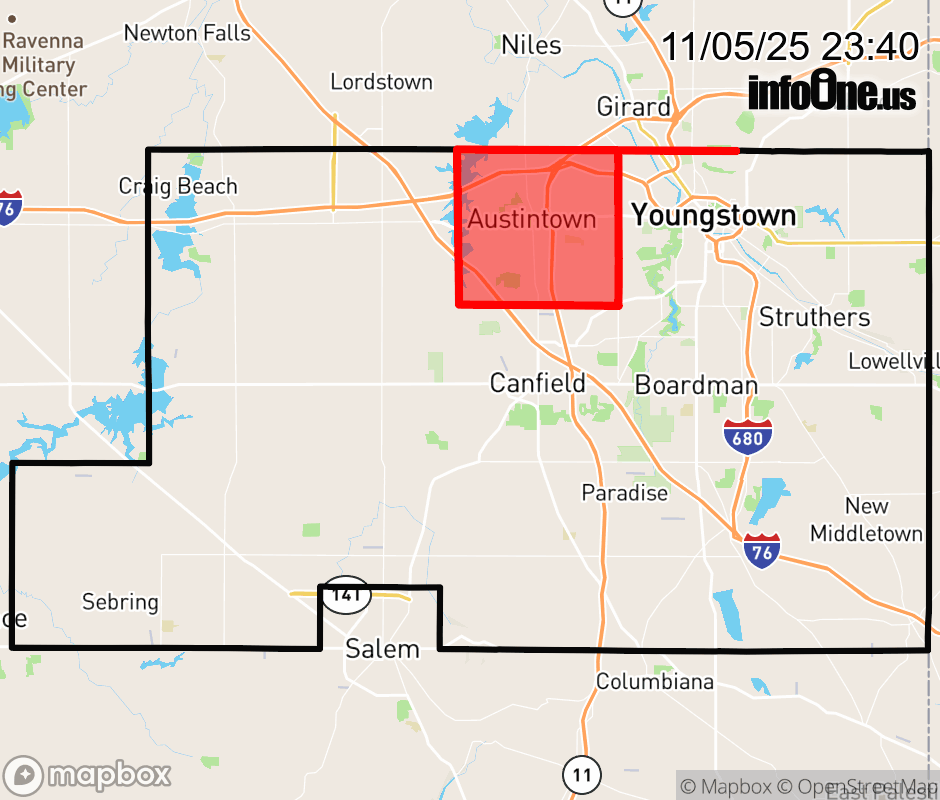 Canceled 11/6/25 12:20 PM Mahoning County has 1 power outage affecting 2 customers. Ohio Edison 2 without power Boardman Township: Customers affected: 19 (< 1%) Estimated repair: Thu 1:30 PM Updated: Thu 11/6/25 11:50 AM EST ![]() Updated: Wed 11/5/25 11:40 PM EST |