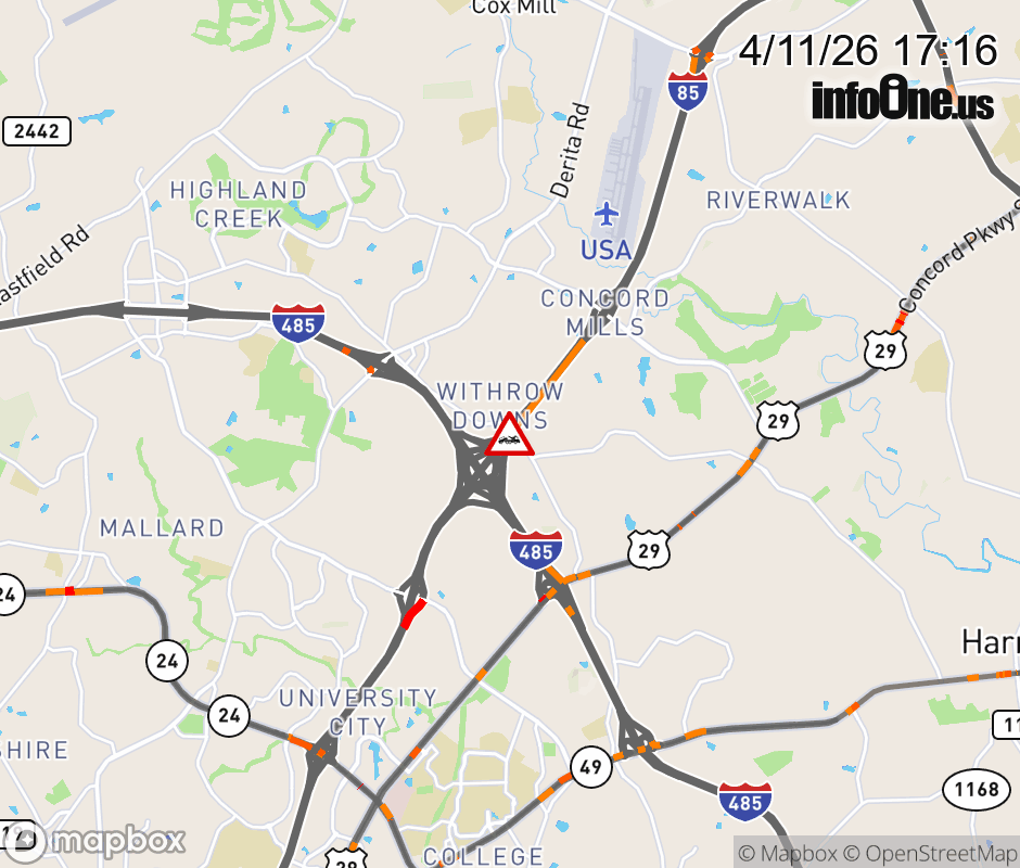 The right shoulder is closed at Exit 48 (I-485). Updated: Sat 4/11/26 5:16 PM EDT ![]() Updated: Sat 4/11/26 5:16 PM EDT |