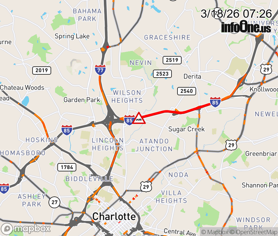The Right shoulder is closed at Exit 39 (Statesville Ave.). Updated: Wed 3/18/26 7:26 AM EDT ![]() Updated: Wed 3/18/26 7:26 AM EDT |