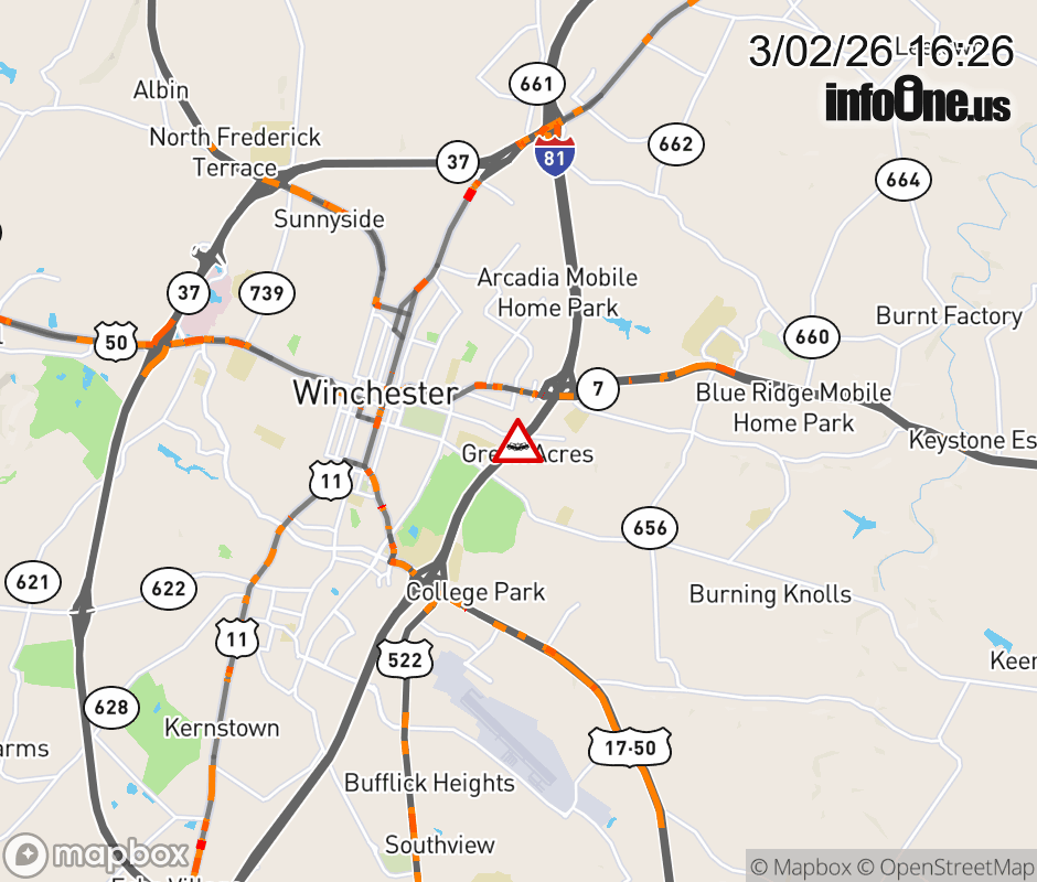 On I-81 at mile marker 315 in the County of Frederick, motorists can expect delays due to a vehicle crash. The south entrance ramp narrows. ![]() |