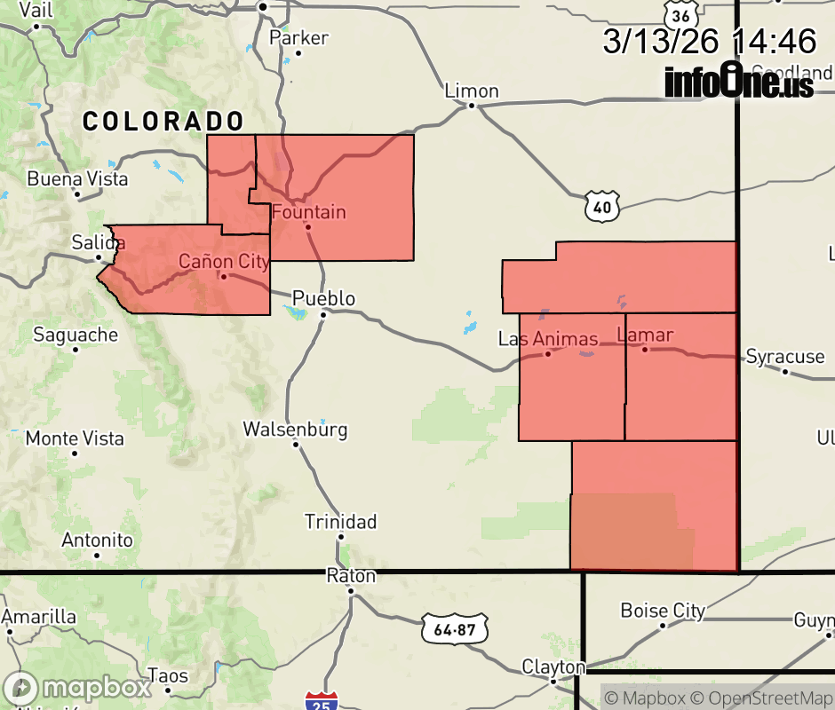 Canceled 3/13/26 9:58 PM Red Flag Warning issued March 13 at 12:44PM MDT until March 14 at 10:00PM MDT by NWS Pueblo CO * AFFECTED AREA... Fire Weather Zones 221, 234, 235, 236 and 237. * WINDS... Southwest 15 to 25 mph with gusts up to 55 mph. * RELATIVE HUMIDITY... For 221, As low as 13 percent. For Zones 234 through 237, As low as 9 percent. * IMPACTS... Extreme fire danger is expected. Fires could uncontrollably spread and be very destructive. ![]() |