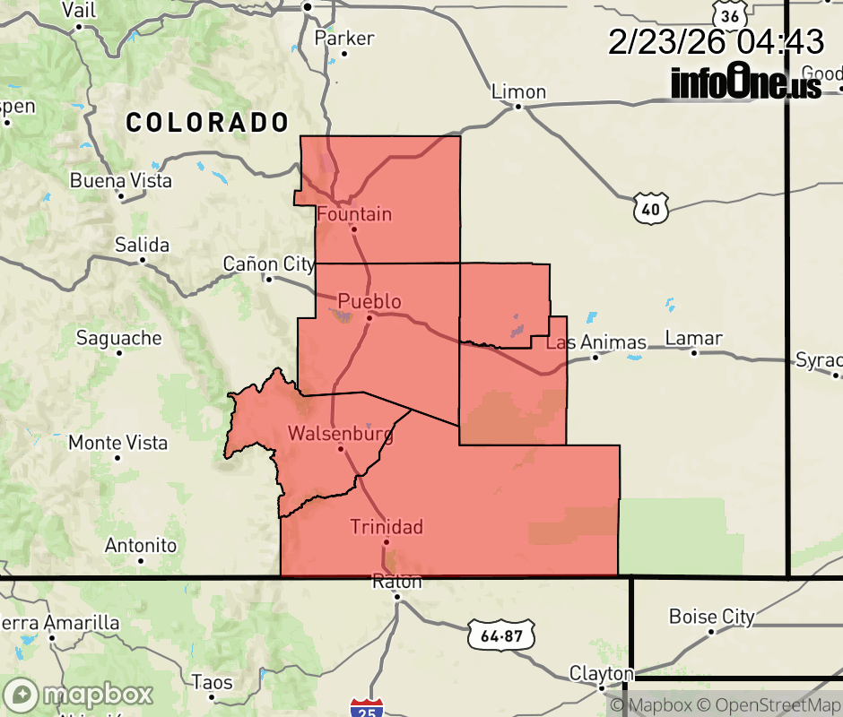 Canceled 2/23/26 8:21 AM Fire Weather Watch issued February 23 at 2:41AM MST until February 24 at 5:00PM MST by NWS Pueblo CO * AFFECTED AREA... Fire Weather Zones 227, 228, 229, 230, 231 and 232. * WINDS... West 15 to 25 mph with gusts up to 35 mph. * RELATIVE HUMIDITY... As low as 10 percent. * IMPACTS... Fires will catch and spread quickly. Exercise extreme caution with any outdoor burning. ![]() |