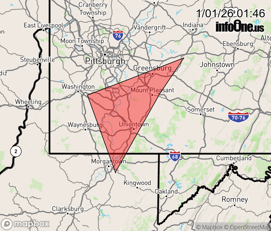 Canceled 1/1/26 1:58 AM Snow Squall Warning issued January 1 at 1:45AM EST until January 1 at 2:15AM EST by NWS Pittsburgh PA The National Weather Service in Pittsburgh has issued a * Snow Squall Warning for... South Central Allegheny County in southwestern Pennsylvania... Western Fayette County in southwestern Pennsylvania... Eastern Greene County in southwestern Pennsylvania... Southeastern Washington County in southwestern Pennsylvania... Southwestern Westmoreland County in southwestern Pennsylvania... Northeastern Monongalia County in northern West Virginia... * Until 215 AM EST. * At 145 AM EST, a dangerous snow squall was located along a line from over Ligonier to over Fredericktown-Millsboro, or along a line from 9 miles southeast of Latrobe to 11 miles northeast of Waynesburg, moving southeast at 30 mph. HAZARD...Intense bursts of heavy snow and gusty winds leading to blowing snow and rapidly falling visibility. Wind gusts up to 35 mph. SOURCE...Radar indicated. IMPACT...Travel will become difficult and potentially dangerous within minutes. * Locations impacted include... Morgantown, Greensburg, Uniontown, Jeannette, Latrobe, Connellsville, Monessen, California, Donora, Mount Pleasant, Scottdale, Monongahela, Charleroi, Masontown, McChesneytown-Loyalhanna, Youngwood, West Newton, Bentleyville, Lawson Heights and Brownsville. This includes the following highways... Interstate 68 in West Virginia between mile markers 6 and 11. Interstate 70 in Pennsylvania near mile marker 25...and between mile markers 27 and 57. Pennsylvania Turnpike between mile markers 69 and 83. ![]() |