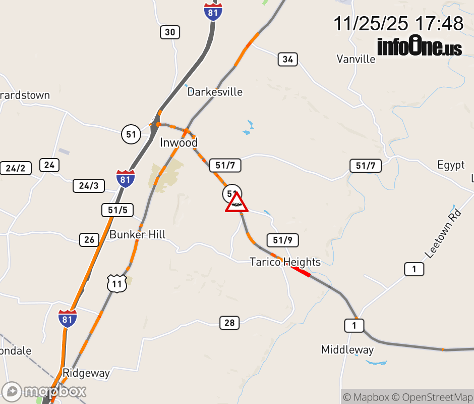 Vehicle Crash on WV-51 (Middleway Pike) & CR-51/9 (Three Run Rd) in Inwood. The northbound road is closed. The southbound road is closed. Updated: Tue 11/25/25 5:48 PM EST ![]() Updated: Tue 11/25/25 5:48 PM EST |