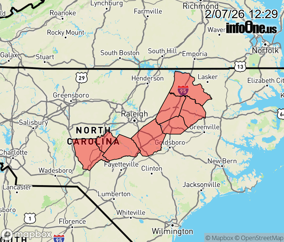 Canceled 2/7/26 7:00 PM Cold Weather Advisory issued February 7 at 12:27PM EST until February 8 at 10:00AM EST by NWS Raleigh NC * WHAT... For the Wind Advisory, northwest winds 15 to 25 mph with gusts up to 45 mph expected through this afternoon. For the Cold Weather Advisory, very cold wind chills near 10 degrees expected late tonight into Sunday morning. * WHERE... Edgecombe, Halifax, Harnett, Johnston, Lee, Moore, Nash, and Wilson Counties. * WHEN... For the Wind Advisory, until 7 PM EST this evening. For the Cold Weather Advisory, from 11 PM this evening to 10 AM EST Sunday. * IMPACTS... Gusty winds will blow around unsecured outdoor objects. Tree limbs could be blown down and result in scattered power outages. Dangerously cold wind chills could result in hypothermia if precautions are not taken. ![]() |