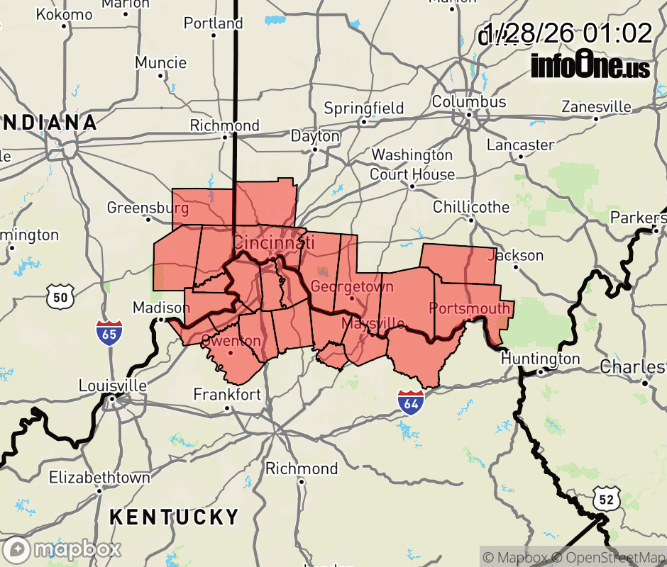 Canceled 1/28/26 11:39 AM Cold Weather Advisory issued January 28 at 1:00AM EST until January 28 at 12:00PM EST by NWS Wilmington OH * WHAT... Very cold wind chills as low as 15 below zero. * WHERE... Portions of southeast Indiana, northeast and northern Kentucky, and south central and southwest Ohio. * WHEN... Until noon EST today. * IMPACTS... The cold wind chills as low as 15 below zero could result in hypothermia if precautions are not taken. ![]() |