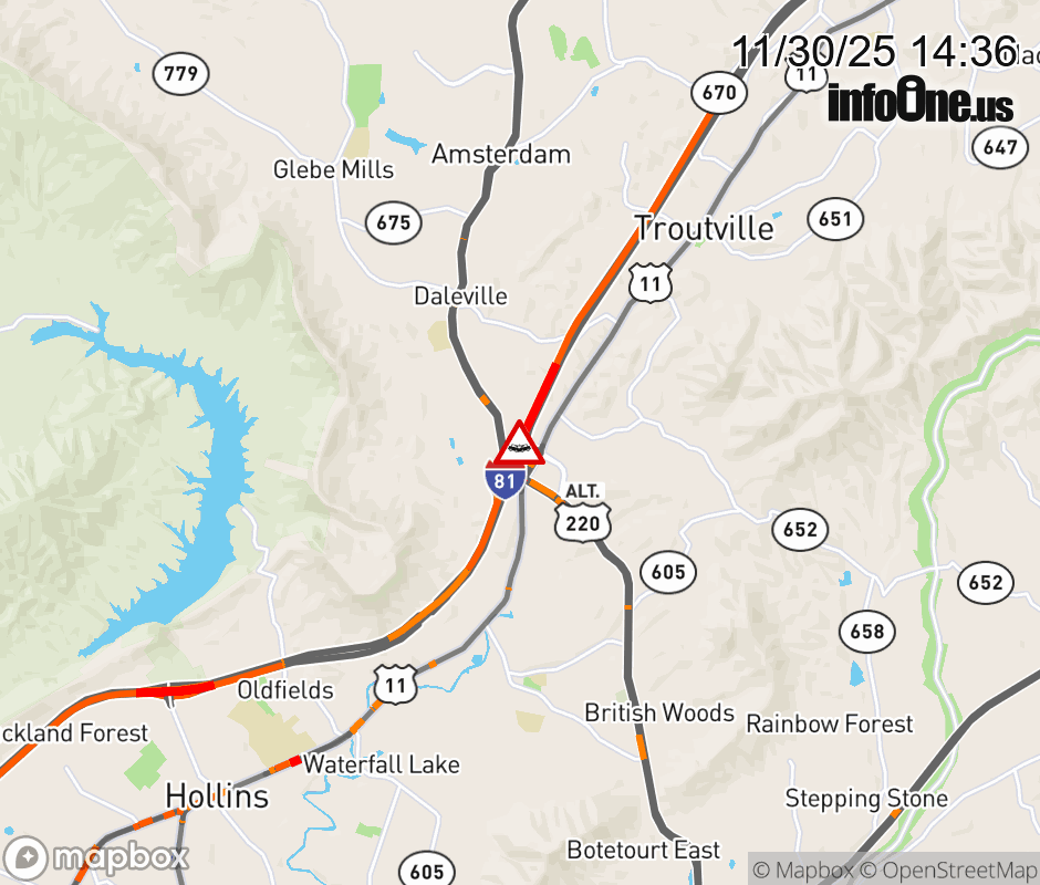 On I-81 at mile marker 150.5 in the County of Botetourt, motorists can expect delays due to a multi-vehicle crash. The south left shoulder and left lane are closed. ![]() |