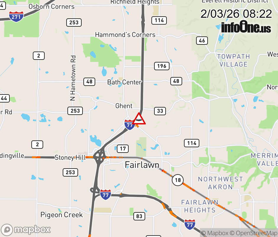 The left lane is blocked on I-77 North beyond Ghent Rd, due to a crash. ![]() |