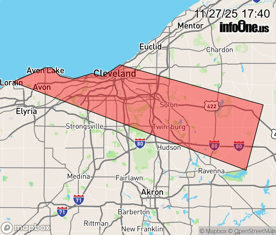 Canceled 11/27/25 7:00 PM Special Weather Statement issued November 27 at 5:38PM EST by NWS Cleveland OH At 534 PM EST, radar indicated an intense lake effect snow band over Westlake, or 11 miles northeast of Elyria, moving east at 30 mph. HAZARDS INCLUDE... Winds to 30 mph... Visibility rapidly dropping to less than a quarter of a mile... Locations impacted include... Cleveland, Lorain, Parma, Lakewood, Cleveland Heights, Westlake, North Royalton, Solon, Avon Lake, Hudson, Twinsburg, Streetsboro, Warrensville Heights, Macedonia, South Russell, Garrettsville, Highland Hills, Mantua, North Olmsted, and Garfield Heights. ![]() |