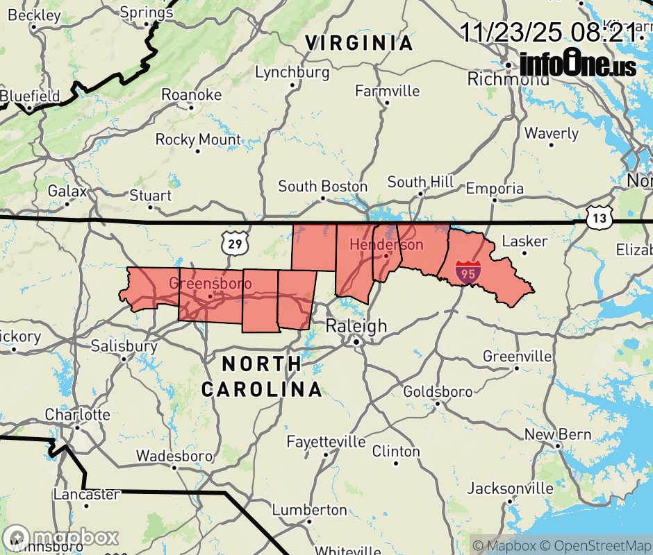 Canceled 11/23/25 10:00 AM Dense Fog Advisory issued November 23 at 8:19AM EST until November 23 at 10:00AM EST by NWS Raleigh NC * WHAT... Visibility of 1/4 mile in dense fog. * WHERE... Alamance, Forsyth, Granville, Guilford, Halifax, Orange, Person, Vance, and Warren Counties. * WHEN... Until 10 AM EST this morning. * IMPACTS... Low visibility could make driving conditions hazardous. * ADDITIONAL DETAILS... Conditions should begin to improve after 9 AM, and the fog should lift by 10 AM. ![]() |