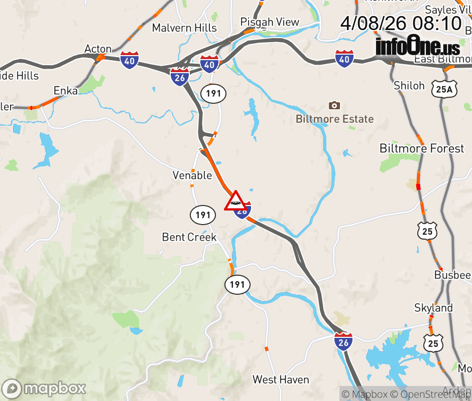 The left shoulder is closed 1.5 miles east of Exit 33, NC 191 (Brevard Road). Updated: Wed 4/8/26 8:10 AM EDT ![]() Updated: Wed 4/8/26 8:10 AM EDT |