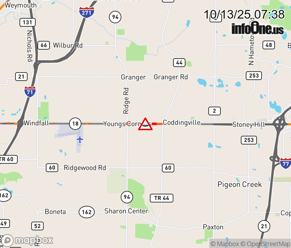 Expect lane closures on SR-18 in both directions at Bambeck Rd. (MM: 19.1), due to crash. Expect lane closures on SR-18 in both directions at Bambeck Rd. (MM: 19.1), due to crash. Updated: Mon 10/13/25 7:38 AM EDT ![]() Updated: Mon 10/13/25 7:38 AM EDT |