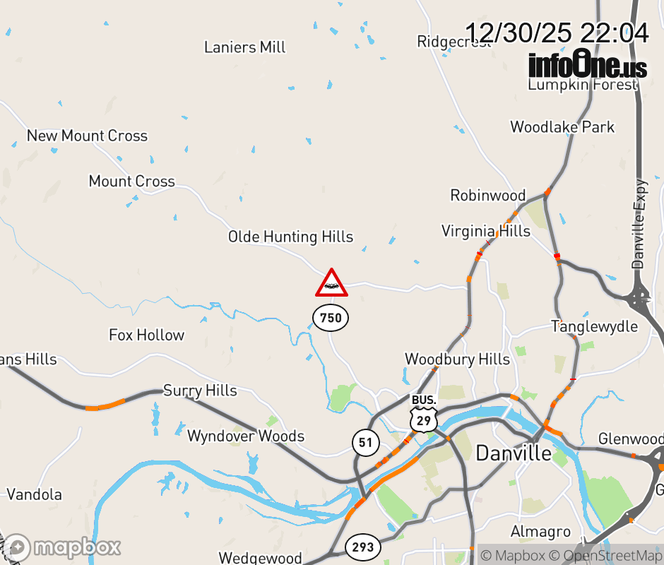 On Rt. 750 North in the County of Pittsylvania, in the vicinity of Mount Olivet Ln; Rt. 1520E/W (Pittsylvania County), motorists can expect delays due to a vehicle crash. Lane closures exist. ![]() |