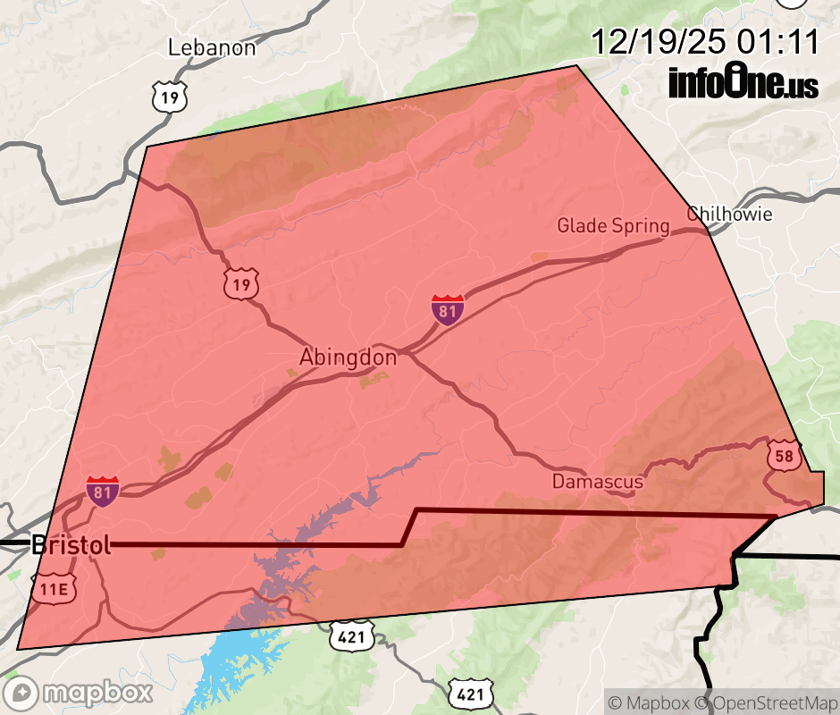 Canceled 12/19/25 1:30 AM Severe Thunderstorm Warning issued December 19 at 1:09AM EST until December 19 at 1:30AM EST by NWS Morristown TN At 109 AM EST, a severe thunderstorm was located over Abingdon, moving east at 50 mph. HAZARD...60 mph wind gusts. SOURCE...Radar indicated. IMPACT...Expect damage to roofs, siding, and trees. Locations impacted include... Bristol Tn, Bristol Va, Abingdon, Glade Spring, Damascus, Lindell, Holston, Emory-Meadowview, Hilander Park, and Harr. This includes Interstate 81 in Virginia between mile markers 3 and 34. ![]() |