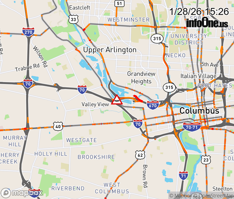 The right lane is blocked on I-670 West beyond US-33, due to a crash. ![]() |