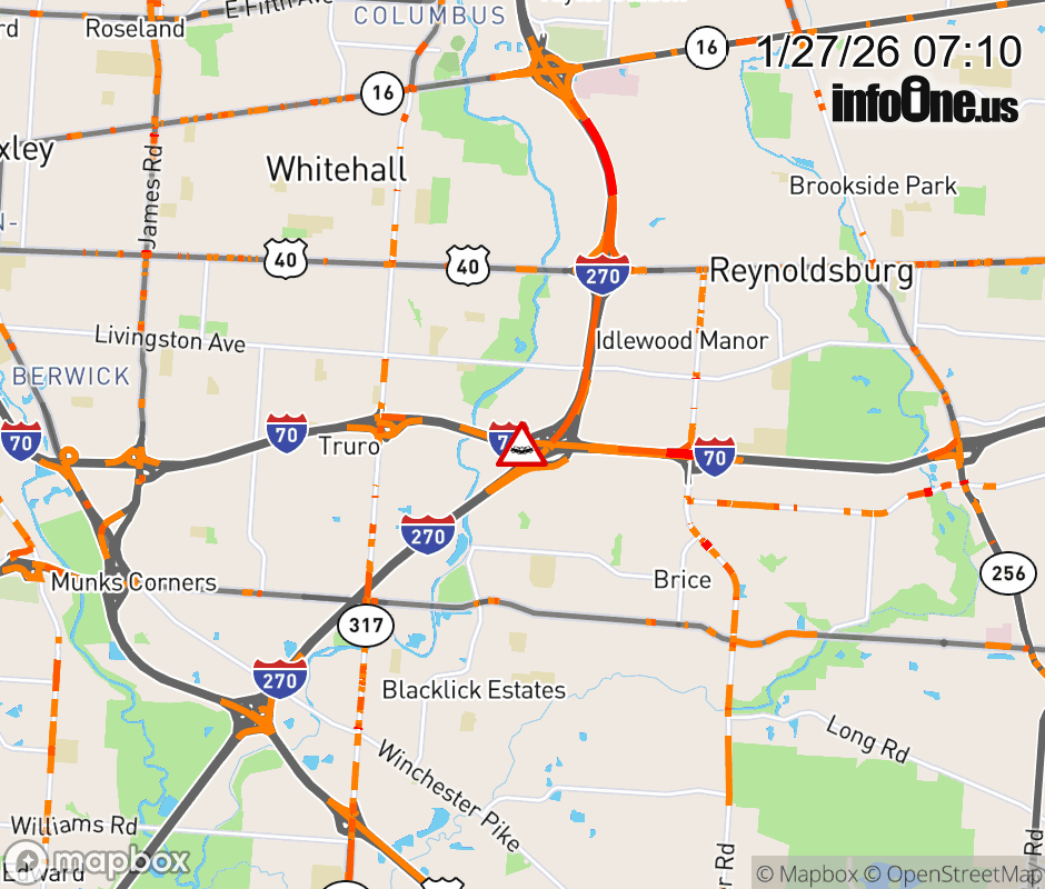 The left lane is blocked on I-70 East beyond I-270 (East Side), due to a crash. Updated: Tue 1/27/26 7:10 AM EST ![]() Updated: Tue 1/27/26 7:10 AM EST |
