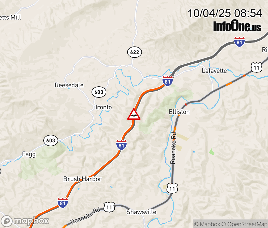 On I-81 at mile marker 126.4 in the County of Montgomery, motorists can expect delays due to a tractor trailer crash. The south right shoulder is closed. Updated: Sat 10/4/25 8:54 AM EDT ![]() Updated: Sat 10/4/25 8:54 AM EDT |