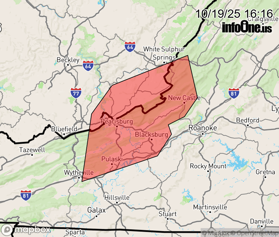 Canceled 10/19/25 4:52 PM Severe Thunderstorm Warning issued October 19 at 4:15PM EDT until October 19 at 5:15PM EDT by NWS Blacksburg VA SVRRNK The National Weather Service in BLACKSBURG has issued a * Severe Thunderstorm Warning for... Southwestern Alleghany County in west central Virginia... Pulaski County in southwestern Virginia... Giles County in southwestern Virginia... Craig County in southwestern Virginia... The City of Radford in southwestern Virginia... Northeastern Bland County in southwestern Virginia... Northeastern Wythe County in southwestern Virginia... Montgomery County in southwestern Virginia... South central Greenbrier County in southeastern West Virginia... Southeastern Summers County in southeastern West Virginia... Southeastern Mercer County in southeastern West Virginia... Monroe County in southeastern West Virginia... * Until 515 PM EDT. * At 414 PM EDT, severe thunderstorms were located along a line extending from near Asbury to near Bane to near Coleman Store, moving northeast at 45 mph. HAZARD...60 mph wind gusts. SOURCE...Radar indicated. IMPACT...Expect damage to roofs, siding, and trees. * Locations impacted include... Blacksburg... Christiansburg... Radford... Alleghany... Pulaski... Wytheville... and Pearisburg. ![]() |