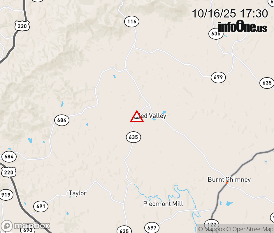 On Rt. 635 North in the County of Franklin, in the vicinity of Red Valley Rd; Rt. 657N/S (Franklin County), motorists can expect delays due to a vehicle crash. Lane closures exist. ![]() |