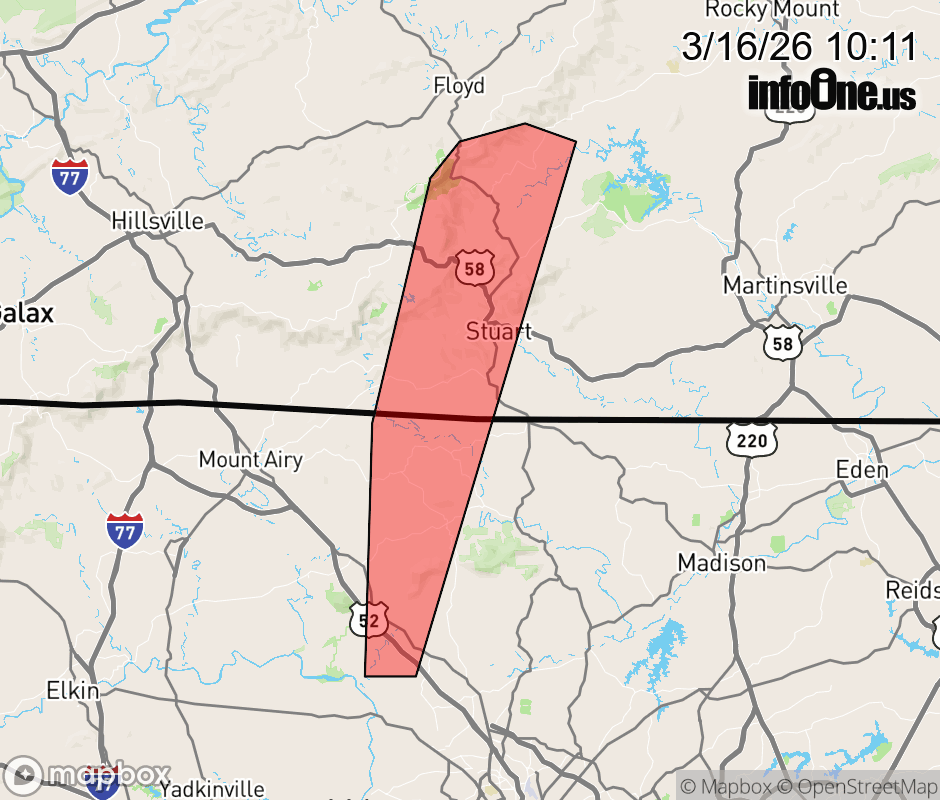 Canceled 3/16/26 10:30 AM Severe Thunderstorm Warning issued March 16 at 10:10AM EDT until March 16 at 10:30AM EDT by NWS Blacksburg VA At 1009 AM EDT, severe thunderstorms were located along a line extending from Buffalo Ridge to near King, moving east at 30 mph. HAZARD...60 mph wind gusts. SOURCE...Radar indicated. IMPACT...Expect damage to roofs, siding, and trees. Locations impacted include... Stuart... Francisco... Woolwine... King... Buffalo Ridge... Pinnacle... and Collinstown. ![]() |