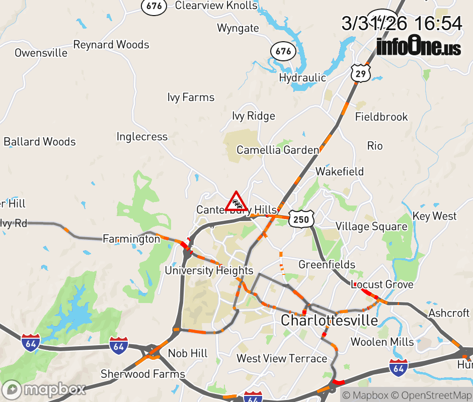On Rt. 654 in the County of Albemarle, in the vicinity of Barracks Rd; Georgetown Rd; Rt. 654W (Albemarle County); Rt. 656N/S (Albemarle County), motorists can expect delays due to a vehicle fire. All east lanes are closed. All west lanes are closed. Updated: Tue 3/31/26 4:54 PM EDT ![]() Updated: Tue 3/31/26 4:54 PM EDT |