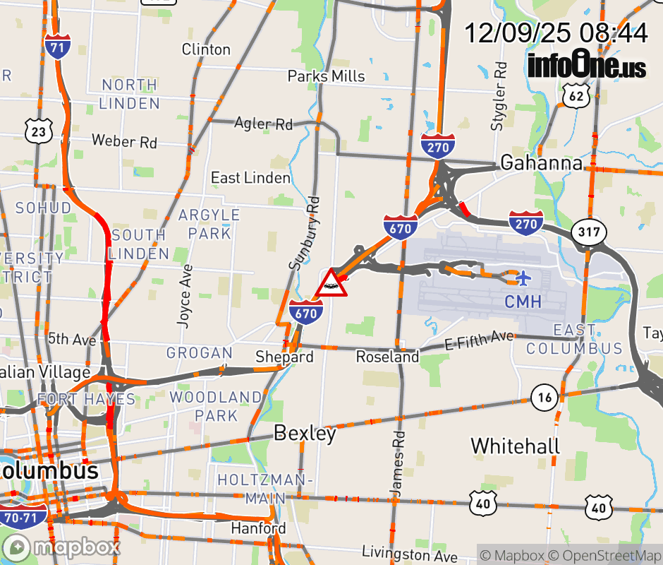 The left shoulder is blocked on I-670/US-62 West beyond Airport/Cassady Ave/Stelzer Rd, due to a crash. ![]() |