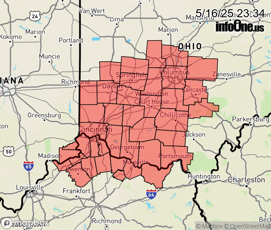Canceled 5/17/25 12:11 AM Tornado Watch issued May 16 at 11:33PM EDT until May 17 at 3:00AM EDT by NWS Wilmington OH TORNADO WATCH 269 REMAINS VALID UNTIL 3 AM EDT SATURDAY FOR THE FOLLOWING AREAS IN INDIANA THIS WATCH INCLUDES 2 COUNTIES IN SOUTHEAST INDIANA OHIO SWITZERLAND IN KENTUCKY THIS WATCH INCLUDES 12 COUNTIES IN NORTHEAST KENTUCKY LEWIS IN NORTHERN KENTUCKY BOONE BRACKEN CAMPBELL CARROLL GALLATIN GRANT KENTON MASON OWEN PENDLETON ROBERTSON IN OHIO THIS WATCH INCLUDES 26 COUNTIES IN CENTRAL OHIO DELAWARE FAIRFIELD FAYETTE FRANKLIN HOCKING LICKING MADISON PICKAWAY UNION IN SOUTH CENTRAL OHIO ADAMS HIGHLAND PIKE ROSS SCIOTO IN SOUTHWEST OHIO BROWN BUTLER CLERMONT CLINTON HAMILTON WARREN IN WEST CENTRAL OHIO CHAMPAIGN CLARK GREENE MIAMI MONTGOMERY PREBLE THIS INCLUDES THE CITIES OF ABERDEEN, ALEXANDRIA, AUGUSTA, BEAVERCREEK, BELLEVUE, BLANCHESTER, BROOKSVILLE, BURLINGTON, BUTLER, CAMDEN, CAMP DIX, CARROLLTON, CHILLICOTHE, CIRCLEVILLE, COVINGTON, CRITTENDEN, DAY HEIGHTS, DAYTON, DELAWARE, DOWNTOWN CINCINNATI, DOWNTOWN COLUMBUS, DOWNTOWN DAYTON, DRY RIDGE, EATON, ERLANGER, FAIRBORN, FAIRFIELD, FALMOUTH, FLORENCE, FORT THOMAS, FRANKLIN, GEORGETOWN, GREENFIELD, HAMILTON, HEAD OF GRASSY, HIGHLAND HEIGHTS, HILLSBORO, INDEPENDENCE, KETTERING, LANCASTER, LANDEN, LEBANON, LOGAN, LONDON, MANCHESTER, MARYSVILLE, MASON, MAYSVILLE, MIDDLETOWN, MILFORD, MOUNT CARMEL, MOUNT OLIVET, MOUNT ORAB, MOUNT REPOSE, MULBERRY, NEWARK, NEWPORT, OAKBROOK, OWENTON, OXFORD, PEEBLES, PICKERINGTON, PIKE LAKE, PIKETON, PIQUA, PLAIN CITY, PORTSMOUTH, RIPLEY, RISING SUN, SEAMAN, SPRINGBORO, SPRINGFIELD, SUMMERSIDE, TIPP CITY, TOLLESBORO, TROY, URBANA, VANCEBURG, VEVAY, WARSAW, WASHINGTON COURT HOUSE, WAVERLY, WEST JEFFERSON, WEST UNION, WHEELERSBURG, WILLIAMSTOWN, WILMINGTON, WINCHESTER, WITHAMSVILLE, AND XENIA. ![]() |
