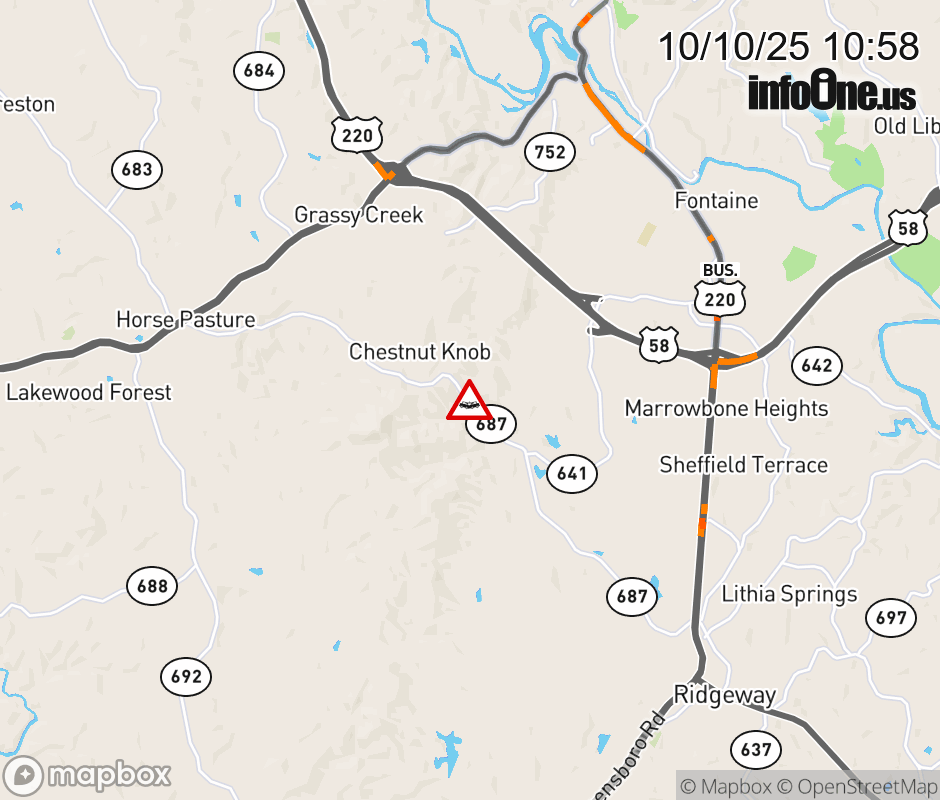 On Rt. 687 in the County of Henry, in the vicinity of Chestnut Knob Rd; Rt. 781N/S (Henry County), motorists can expect delays due to a vehicle crash. All east lanes are closed. ![]() |