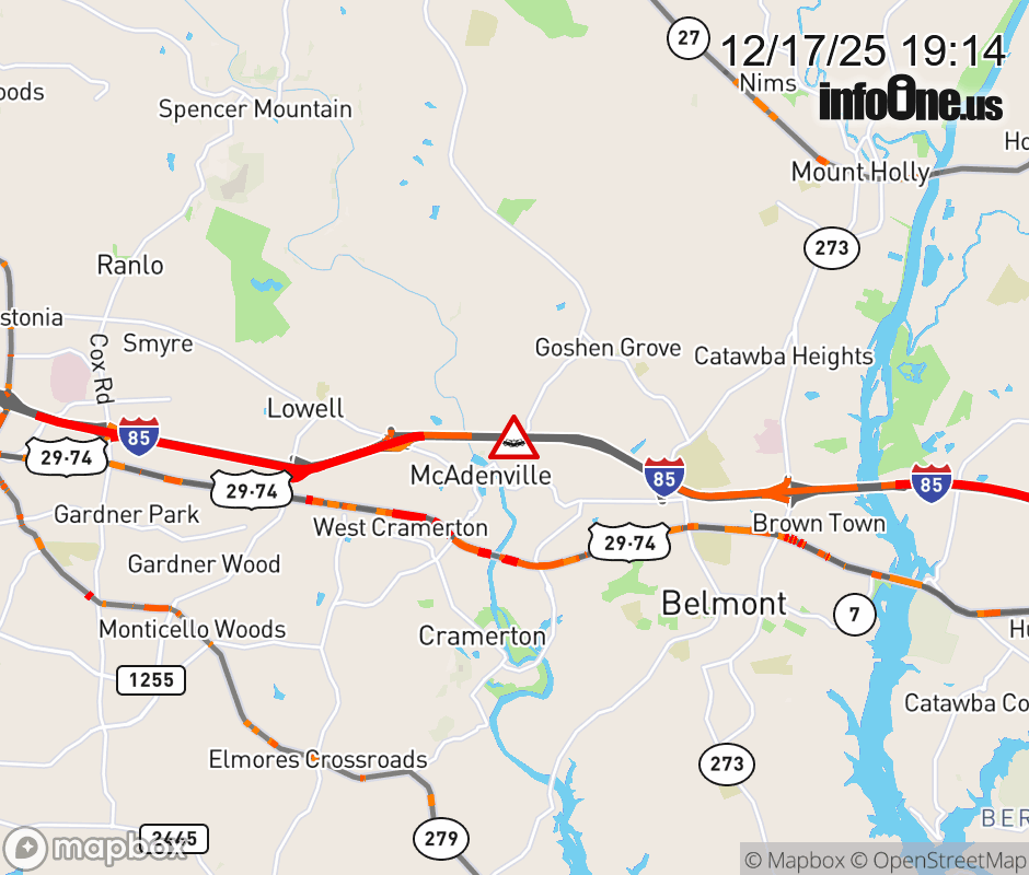 The right shoulder is closed at Exit 23 (McAdenville Rd). Updated: Wed 12/17/25 7:14 PM EST ![]() Updated: Wed 12/17/25 7:14 PM EST |
