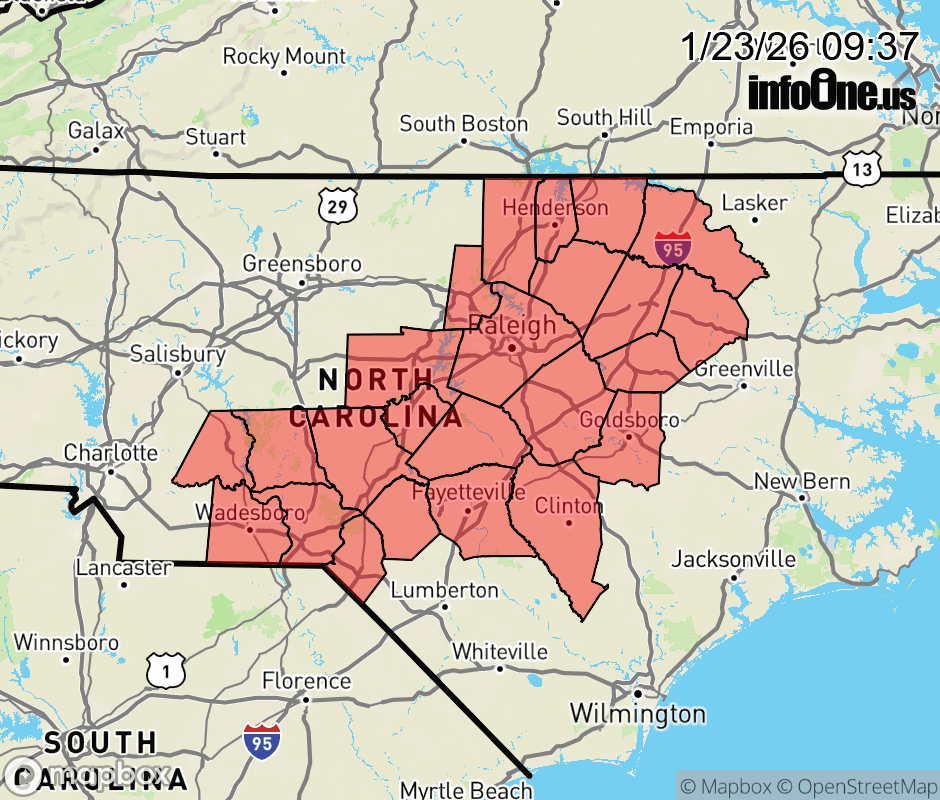 Canceled 1/23/26 1:00 PM Winter Storm Watch issued January 23 at 9:36AM EST until January 26 at 1:00PM EST by NWS Raleigh NC * WHAT... Heavy mixed precipitation possible. Total ice accumulations between one quarter and three quarters of an inch possible. Total sleet and snow accumulations up to two inches. * WHERE... All central North Carolina counties not under a Winter Storm Warning. * WHEN... From Saturday afternoon through Monday afternoon. * IMPACTS... Roads, and especially bridges and overpasses, will likely become slick and hazardous. Significant ice accumulation on power lines and tree limbs may cause widespread and long-lasting power outages. ![]() |