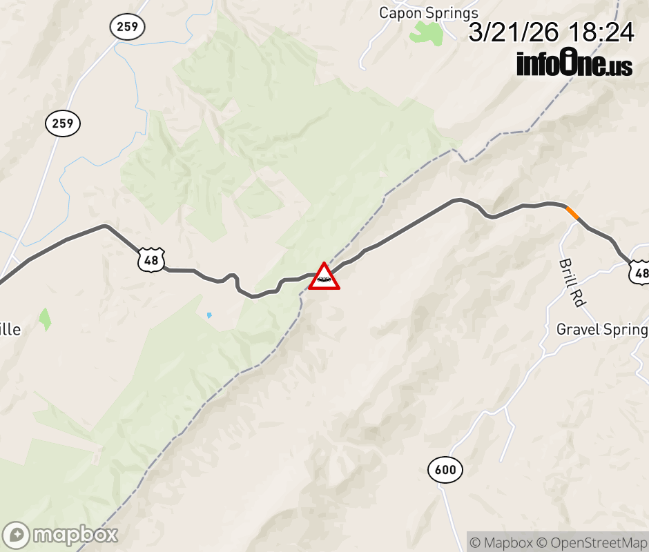 On VA-55 in the County of Frederick, in the vicinity of County/City/Town Line, VIRGINIA STATE LINE, motorists can expect delays due to a vehicle crash. All east lanes are closed. All west lanes are closed. ![]() |