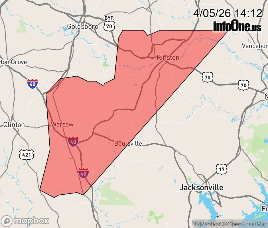 Canceled 4/5/26 3:15 PM Special Weather Statement issued April 5 at 2:11PM EDT by NWS Newport/Morehead City NC At 211 PM EDT, Doppler radar was tracking strong thunderstorms along a line extending from Walnut Creek to near Ammon. Movement was northeast at 30 mph. HAZARD...Wind gusts up to 50 mph. SOURCE...Radar indicated. IMPACT...Gusty winds could knock down tree limbs and blow around unsecured objects. Locations impacted include... Kinston, Wallace, Warsaw, La Grange, Mount Olive, Grifton, Kornegay, Rose Hill, Beulaville, Deep Run, Bowdens, Beautancus, Kenansville, Dawson, Graingers, Institute, Potters Hill, Wyse Fork, Albertson, and Harrells. ![]() |